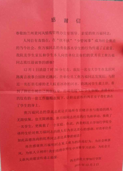 當(dāng)天下午5時(shí)許,蘭州城關(guān)物業(yè)服務(wù)集團(tuán)有限公司黃河風(fēng)情線項(xiàng)目部經(jīng)理寇珀熒接受采訪時(shí)告訴記者,當(dāng)天救人的公廁管理員系城關(guān)物業(yè)職工焦萬(wàn)福。據(jù)寇珀熒介紹,焦萬(wàn)福擔(dān)任該處公廁管理員近2年時(shí)間內(nèi),已經(jīng)多次參與黃河救人,事后好久公司才能從同事處得知。在保證自身安全的前提條件下,公司會(huì)對(duì)這種正能量的行為給予相應(yīng)的精神和物質(zhì)支持和鼓勵(lì)。