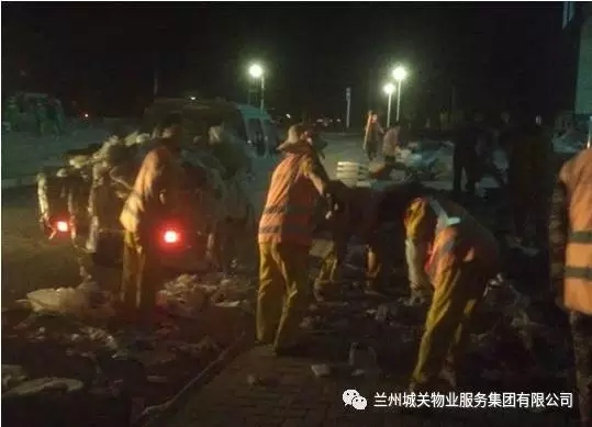 員工于夜晚加班清理宿舍樓下的垃圾