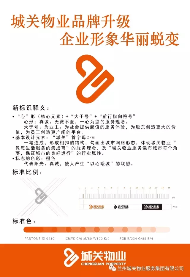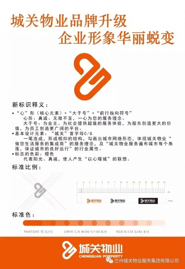 標(biāo)識(shí)是企業(yè)品牌使用頻率最高的視覺符號(hào),是形成品牌視覺形象的核心元素,還是品牌形象的象征與精神體現(xiàn)。城關(guān)物業(yè)服務(wù)集團(tuán)新企業(yè)標(biāo)識(shí)采用了橙色,代表陽光、真誠,使人產(chǎn)生“以心暖城”的聯(lián)想。并將心形、大于號(hào)、前行指向符號(hào)作為核心設(shè)計(jì)元素集于一體。