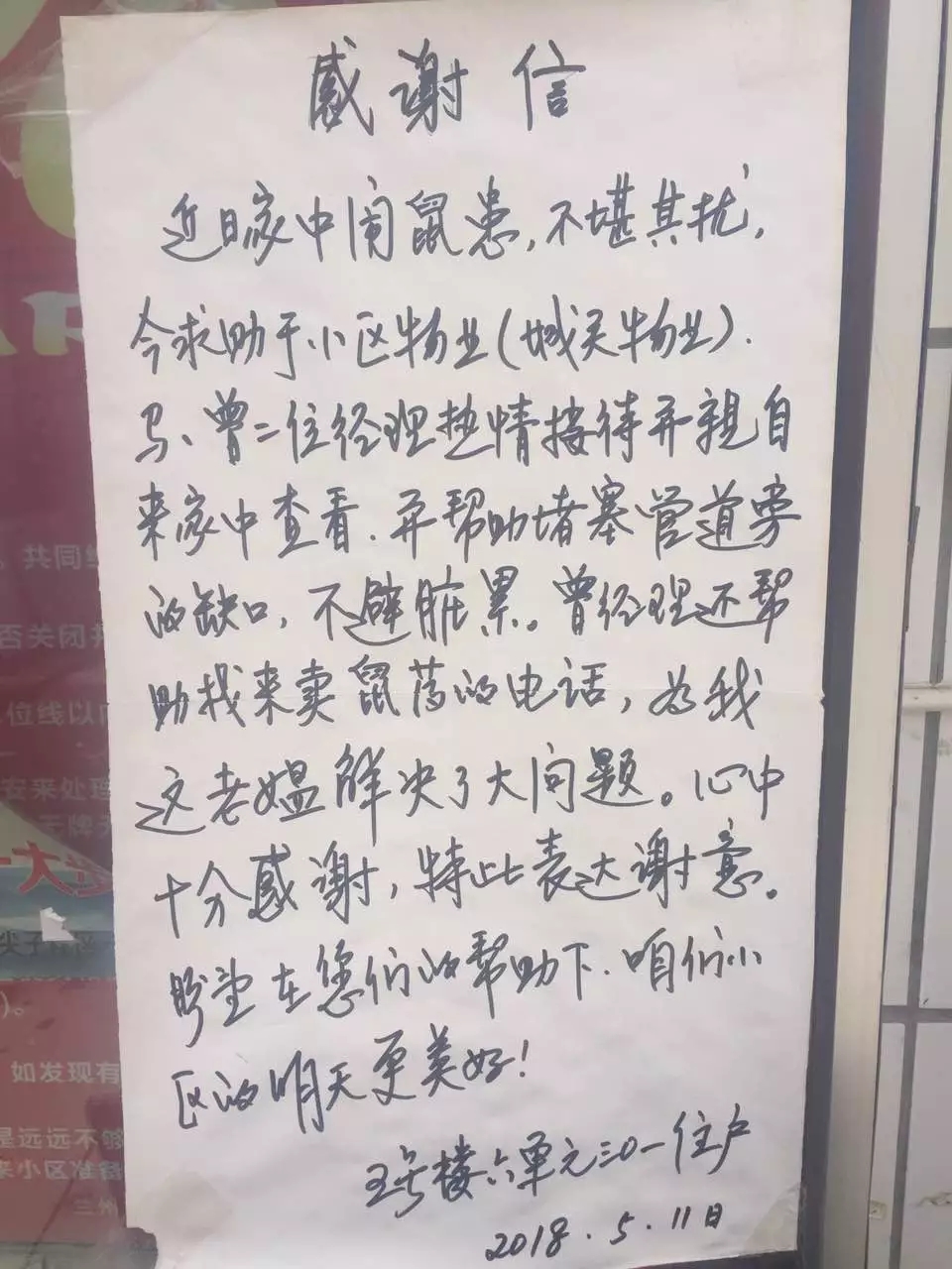 近日,市政府雁寧路小區(qū)院內(nèi)張貼的一封感謝信,引起了大家的注意。原來這封感謝信是該小區(qū)業(yè)主所寫,簡(jiǎn)單樸實(shí)的語言中充滿了對(duì)城關(guān)物業(yè)工作人員的肯定與感激,字里行間體現(xiàn)出了對(duì)我們工作的支持和認(rèn)可!