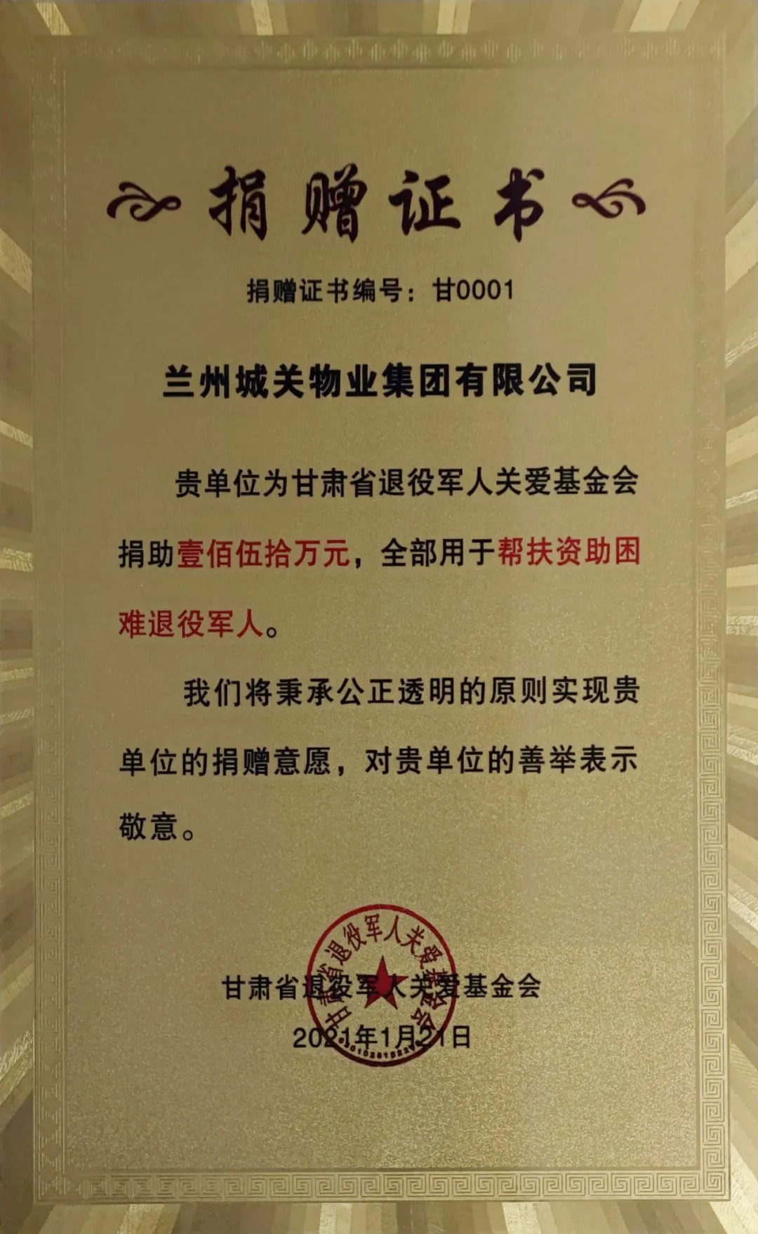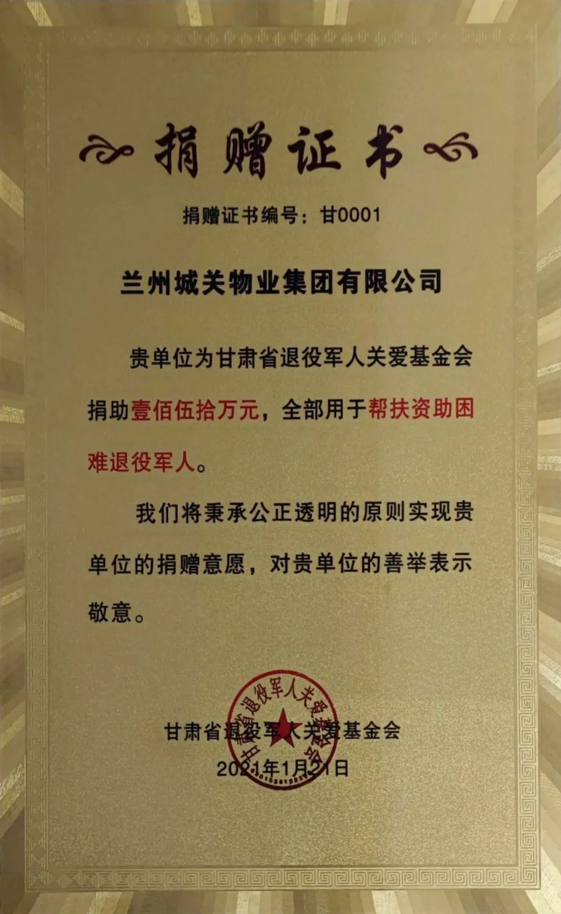 蘭州城關(guān)物業(yè)服務(wù)集團有限公司積極支持國防和軍隊建設(shè),襄助退役軍人扶危濟困事業(yè),向甘肅省退役軍人關(guān)愛基金捐助150萬元善款,以實際行動為幫助退役軍人就業(yè)、解決退役軍人生產(chǎn)生活困難、加強軍政軍民團結(jié)工作貢獻力量、“錦上添花”。